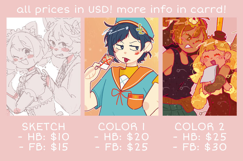 - Will not draw: real people, NSFW, furries, armor/mecha, "problematic" content (age gap, incest, etc)